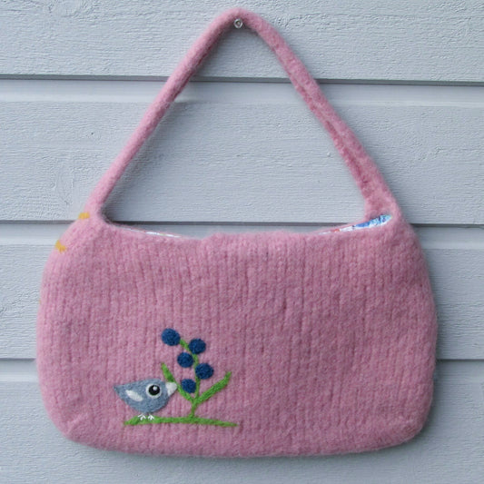 Pick Upお日様と小鳥いっぱいの羊毛フェルトバッグ ピンク