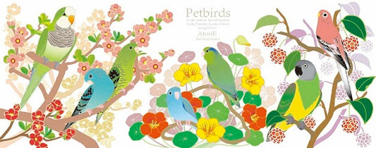 小鳥とお花のポストカード ズグロシロハラインコ、セネガルインコ、カナリア