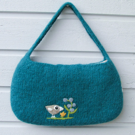 Pick Upお日様と小鳥いっぱいの羊毛フェルトバッグ ターコイズ
