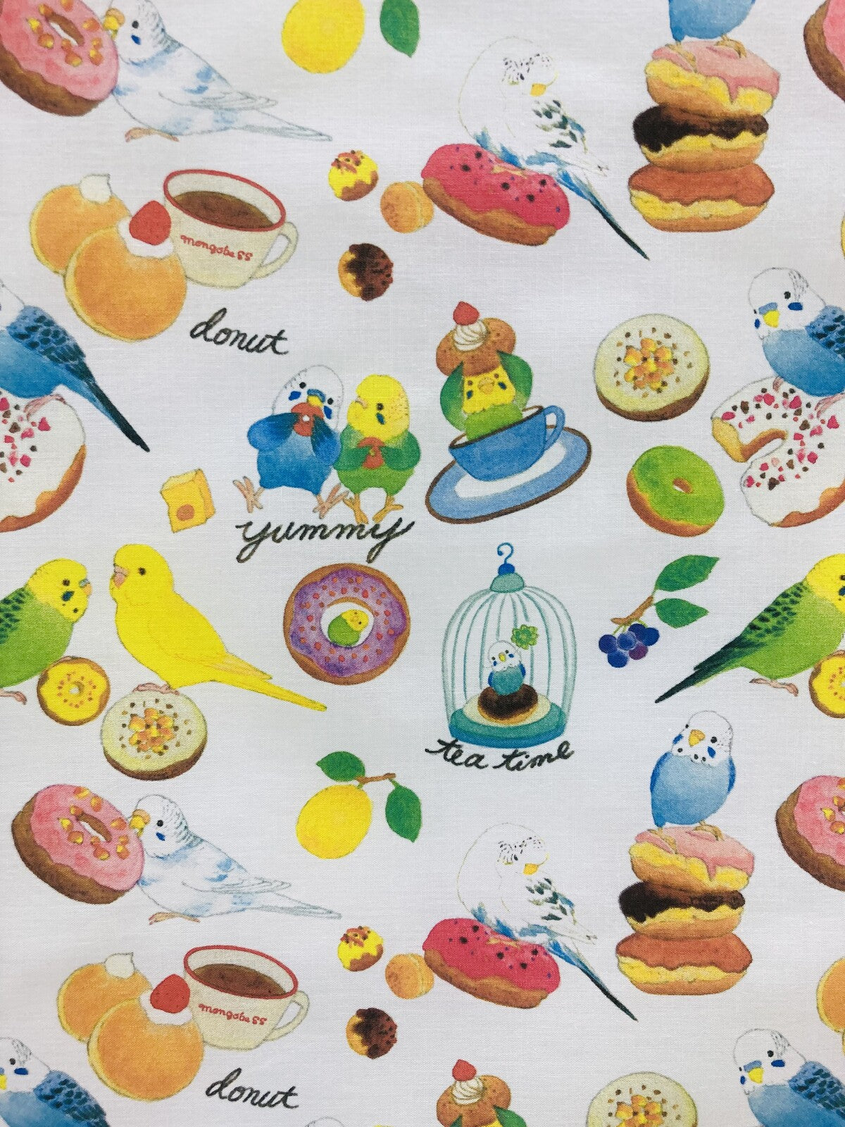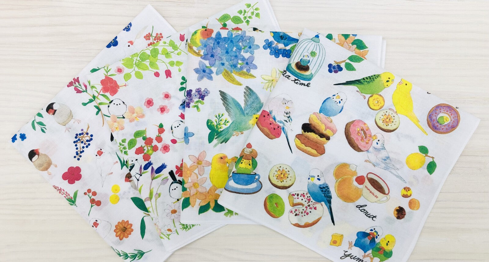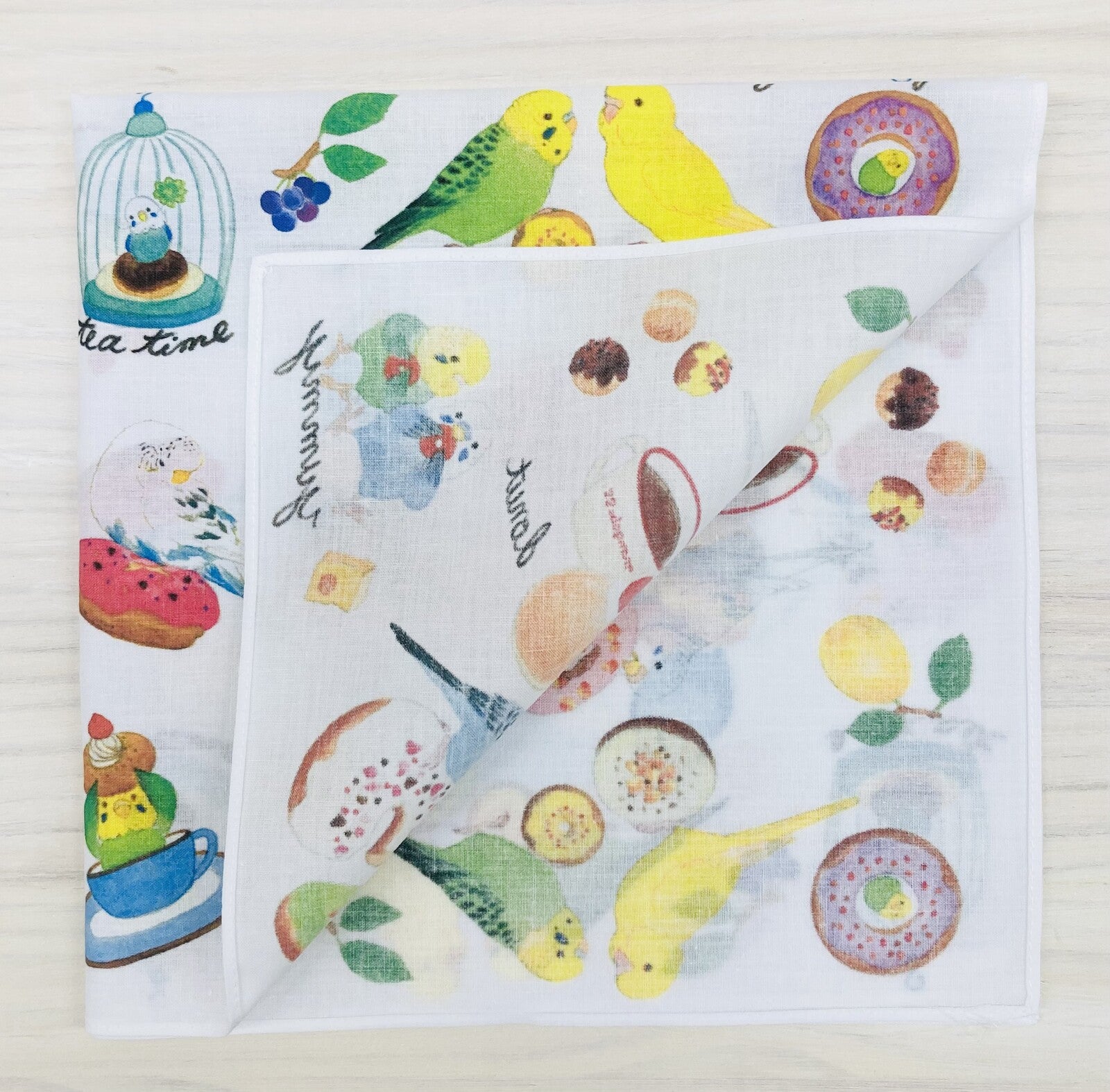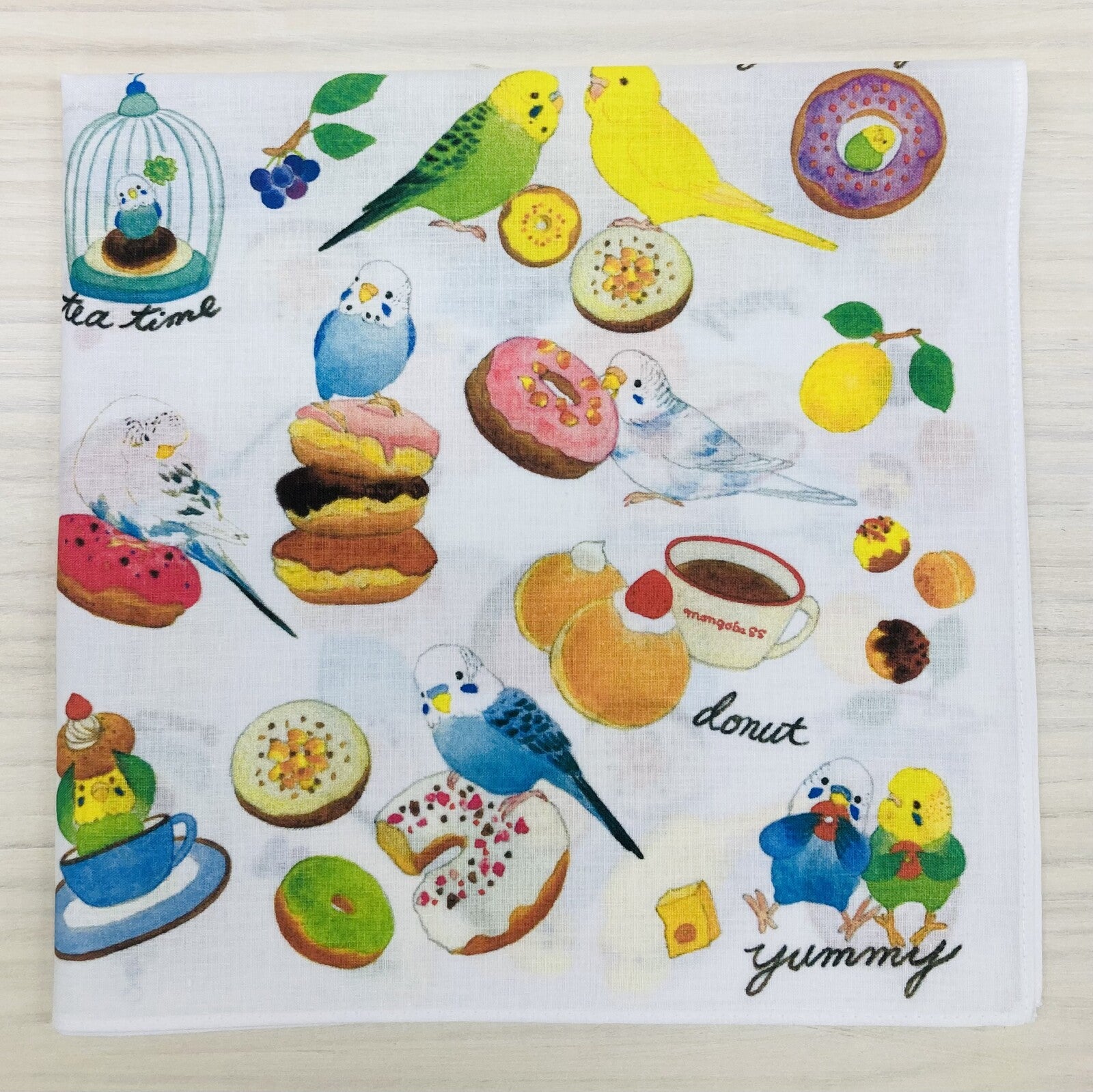 - セキセイインコとおいしそうなドーナツがデザインされた大判ハンカチです。