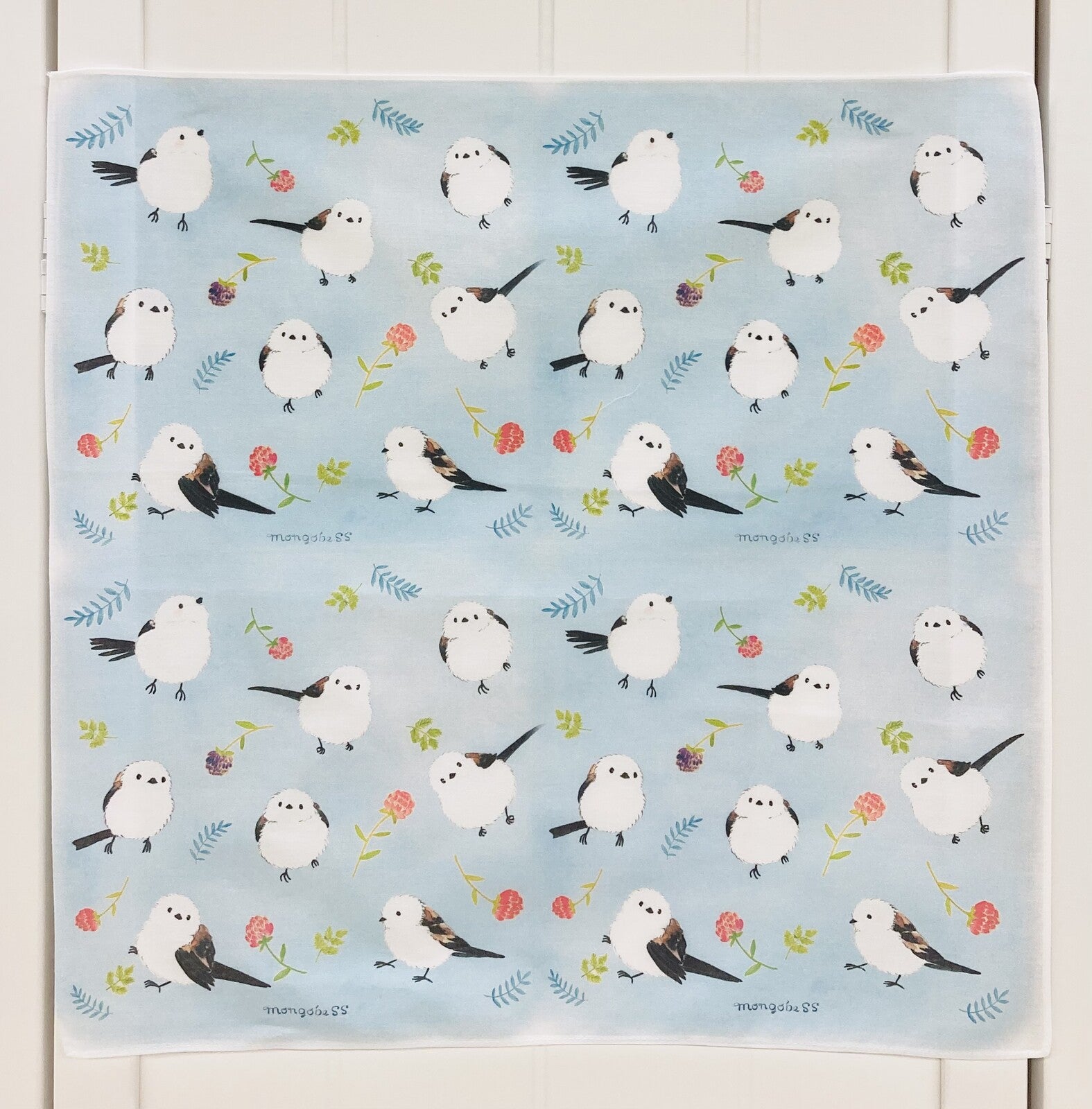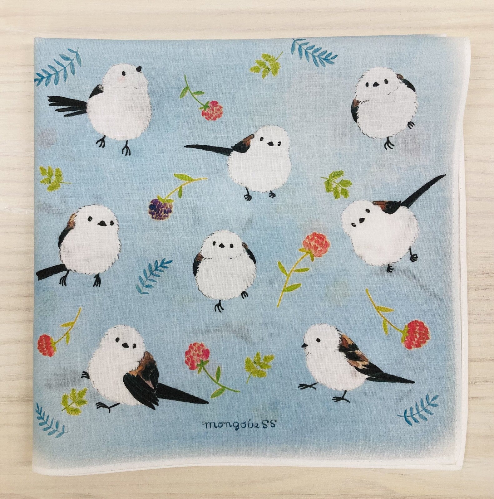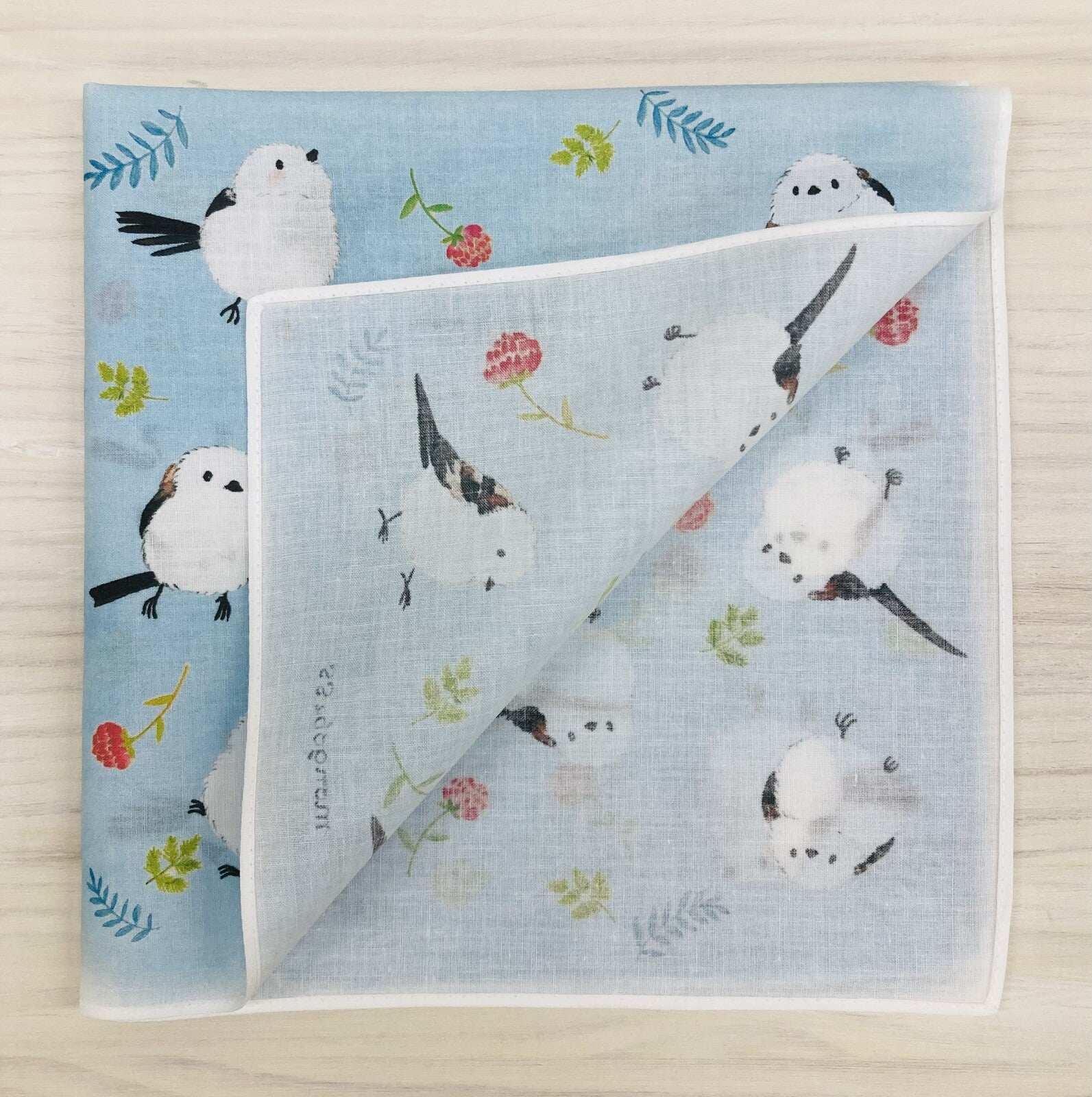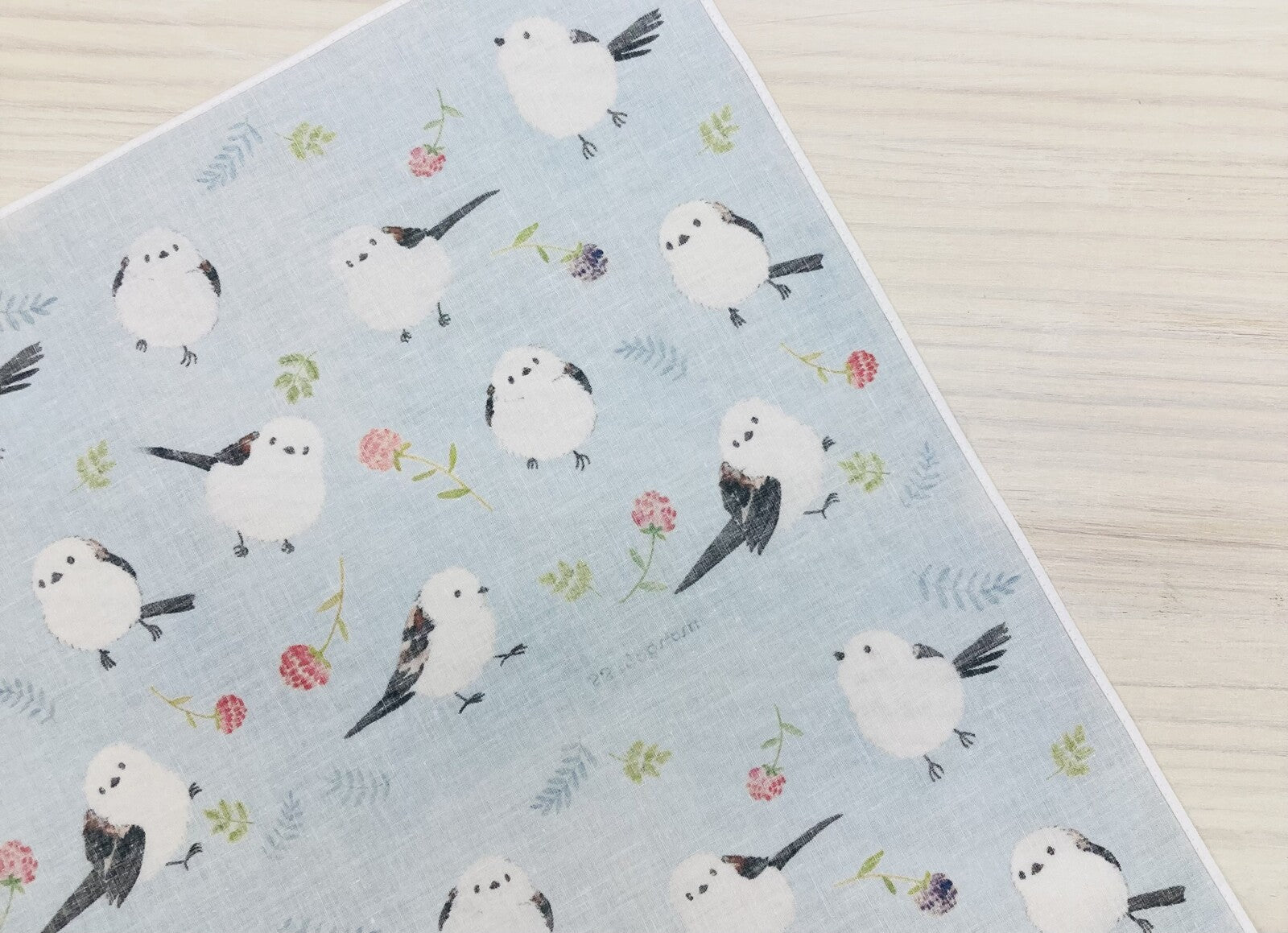 - シマエナガとボタニカルテイストのお花や葉っぱがかわいい大判ハンカチです。