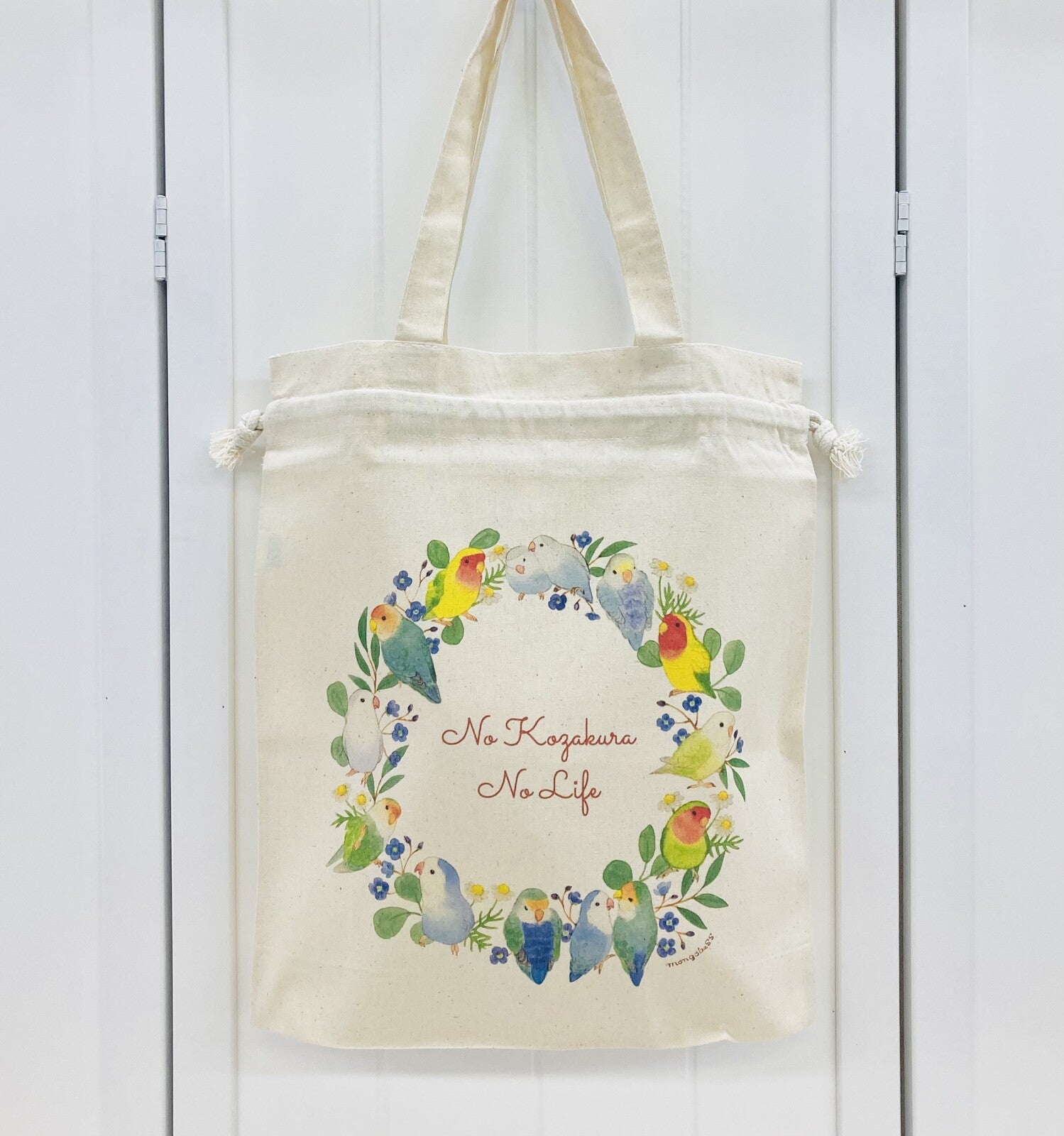 - とってもかわいいコザクラインコの巾着トートバッグです。