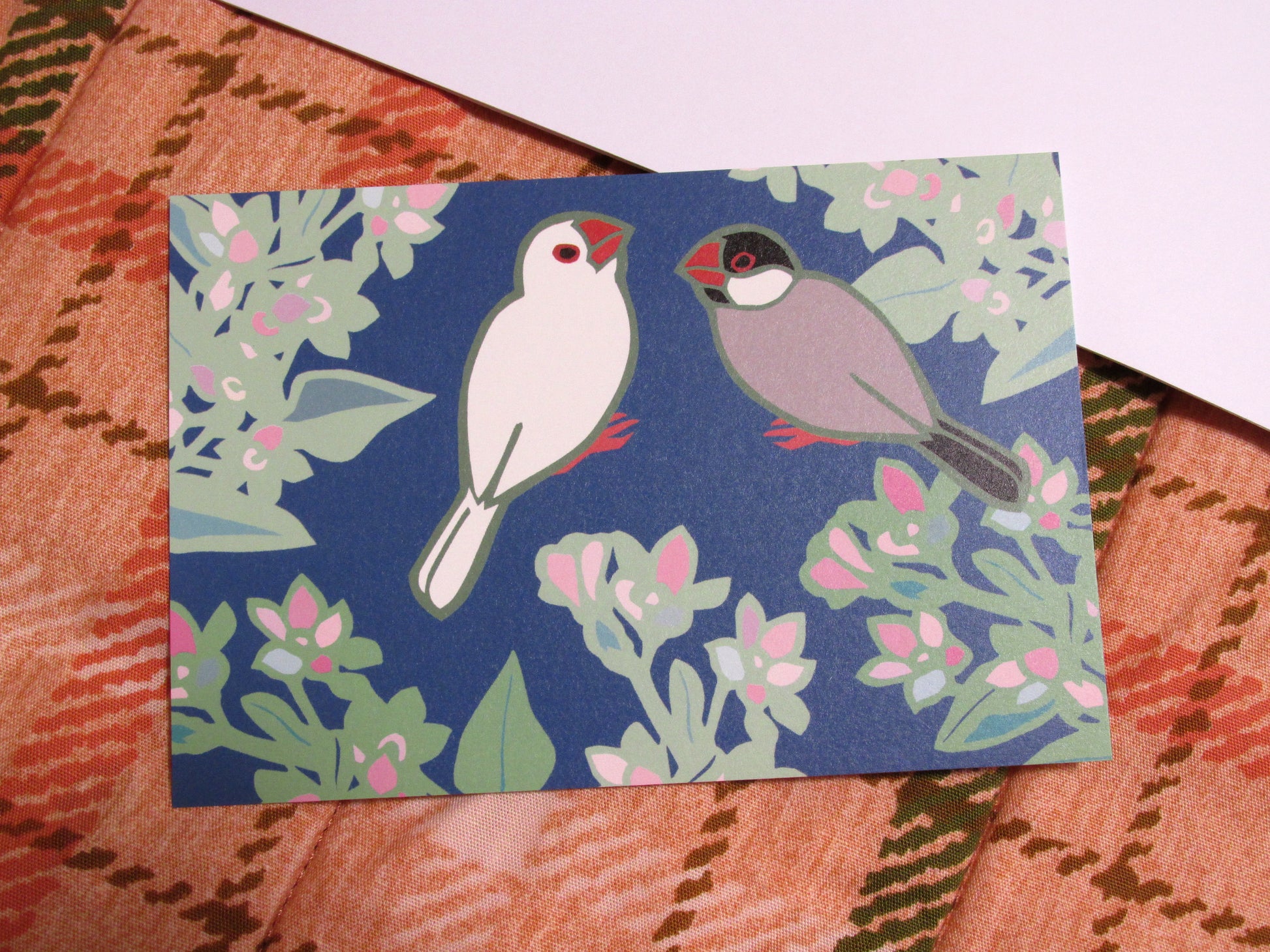 - 切り絵作家サトウユキエさんの切り絵による文鳥デザインのポストカードです。