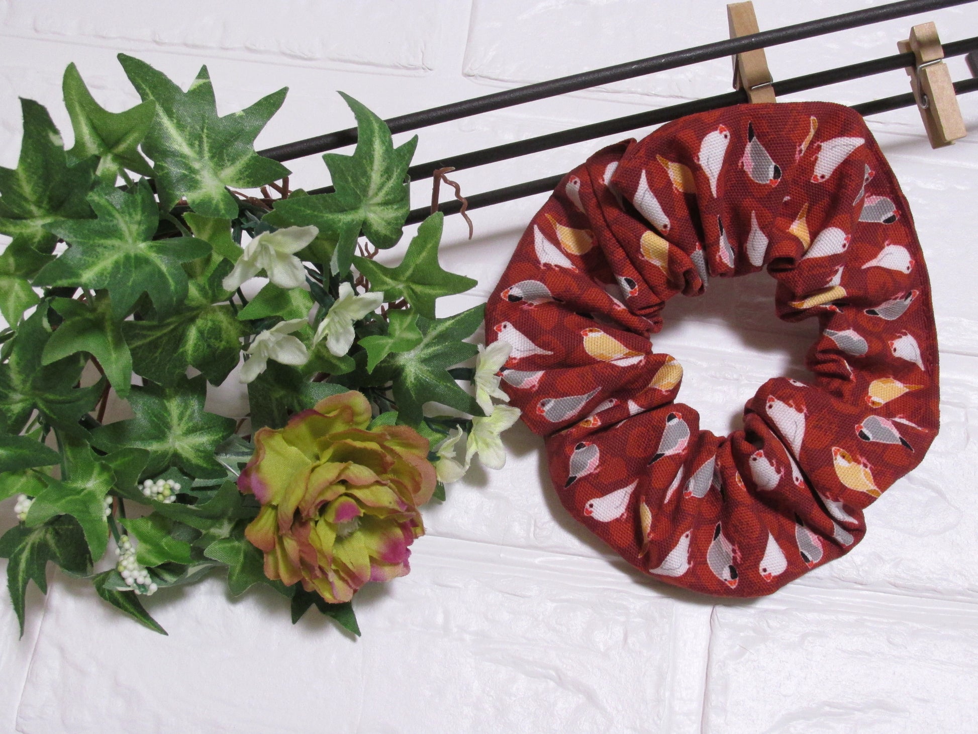- サトウユキエ さんのオリジナルデザインの文鳥柄の布から作ったハンドメイドシュシュです。