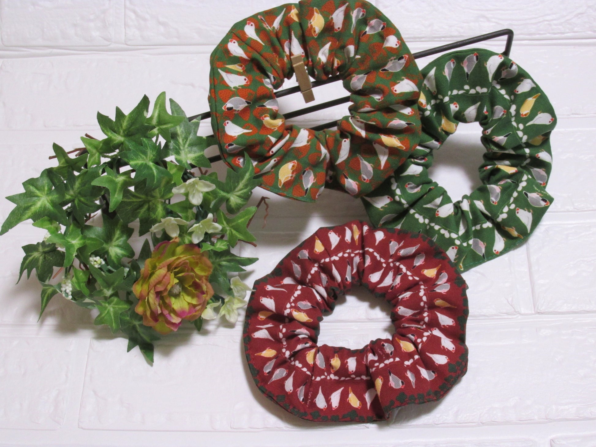 - サトウユキエ さんのオリジナルデザインの文鳥柄の布から作ったハンドメイドシュシュです。