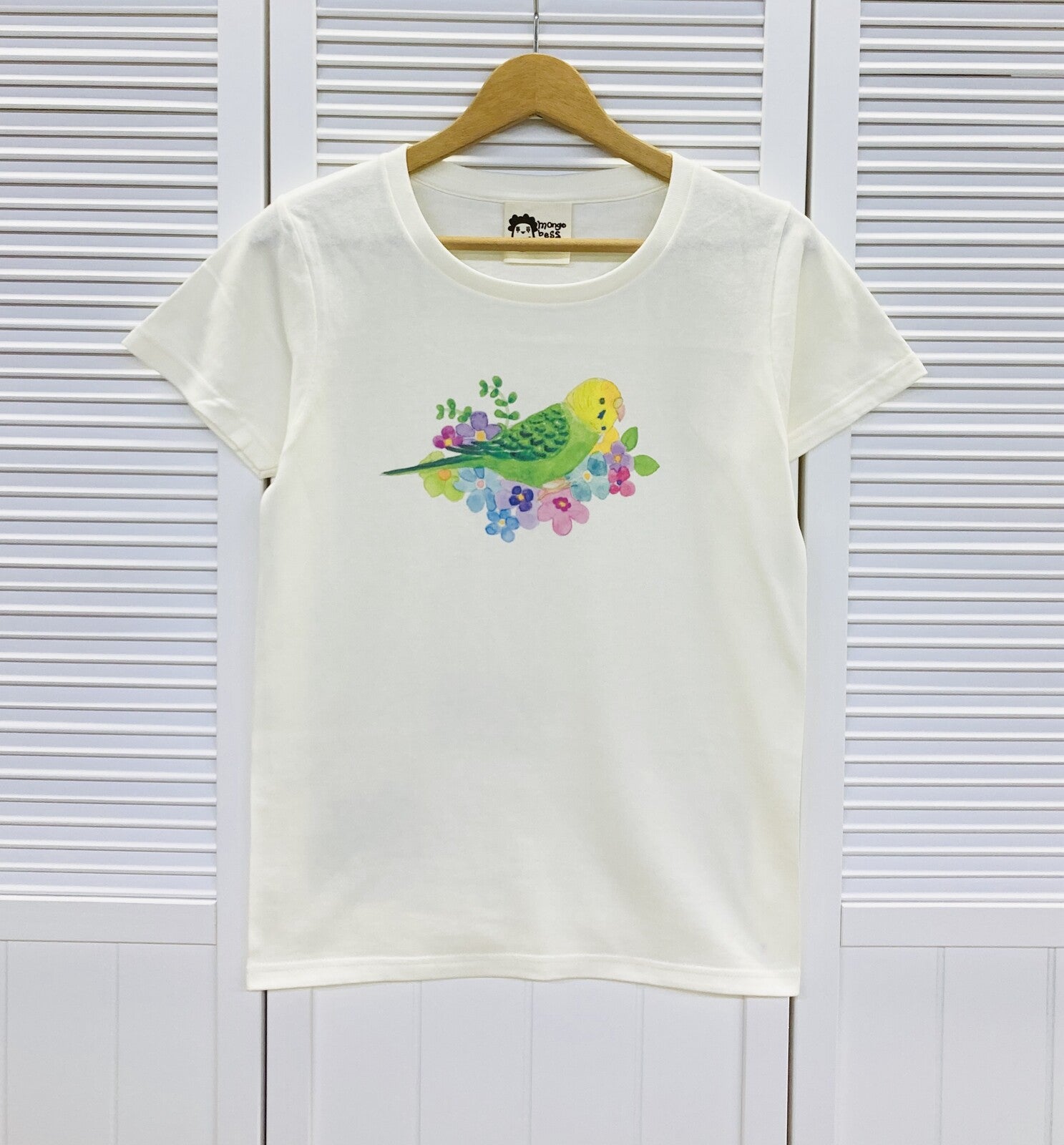 レディースTシャツ フラワーことりシリーズ セキセイインコ グリーン 受注製作 送料無料 クーポン利用不可